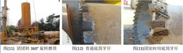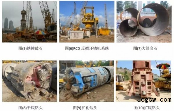 3.障碍清除:磨桩机通过来回“搓动”钢筒外壁使钢筒下沉时,如遇到硬质地层,则首先需要击破石层,才能进一步磨筒。(A)若岩石等级较低,石层较为薄弱,则可以使用大铁锤击打岩体成碎石,再用泥夹从桩孔内夹出即可,如图(5)。(B)若岩石等级较高,石层较厚,则可以使用 RCD 反循环钻机破石钻进。RCD 反循环钻机在动力机( 香港业界称为“车头”) 提供的液压动力下,扭动钻杆并带动钻头一起不断地单方向旋转,依靠钻头上镶嵌的众多“菠萝头”与地层反复摩擦,以达到破石成孔的目的, 如图(6)。按照用途的不同,钻头可以分为三类:第一类是用于竖向成孔的平底钻头,不可以继续磨筒,如图( 8) ;第二类是扩孔钻头,在竖向成孔的同时,可以利用钻头两侧的“菠萝头”加大筒脚以下桩孔的直径,以达到扩孔磨筒的目的,如图( 9); 第三类是扩底钻头,钻头底部无“菠萝头”故不可竖向钻孔,钻头两侧的钻臂张开后可用于成锥形大底, 如图(10) 。( c ) 若遇到某种情况,比如开挖位置出现有孤石,前两种破石方法无法取得好的效果,可先回填 1500mm 的现有桩孔,然后用外径为2000mm,2500mm 等较大的钢筒去成孔,待石块被清除后再回填桩孔,用1500mm的钢筒从新成孔。(D)值得一提的是,使用团团转式磨桩机360 º 旋转钢筒也可以磨断较为薄弱的石层,如图(11) 。与普通磨桩机不同,团团转式磨桩机的底筒筒脚需要安装特制的破石“牙仔”,如图 (12) , (13) 和(14) 。