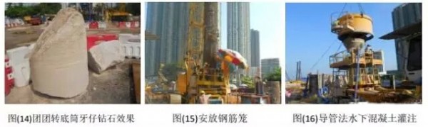 钢筋笼安装完成后,应装入导管进行第二次桩孔清洗及取样,然后就可以灌注混凝土了。在进行导管法水下混凝土灌注的同时,工程师应根据混凝土的实际灌注情况来决定钢筒和导管的抽取长度,直至混凝土灌注完成,所有钢筒和导管抽取完毕,如图(16) 。