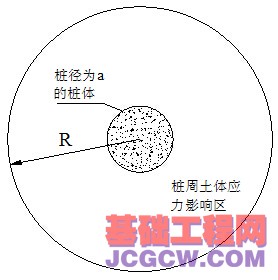 所以研究在无限土体中扩张出一个桩径为a的小孔时,在小孔的周围必然会形成一个应力影响区,如图2所示。图中符号:R为应力影响范围,a为小孔的扩张半径(即桩径)。