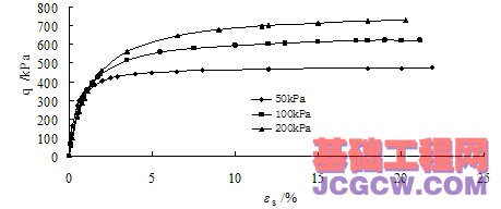 图4在15%含水量下原状黄土广义剪应力与剪应变