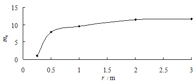 由式(16)可以看出,结构性参数mη随着r的减小而呈现非线性的衰减;距离桩轴越近,黄土的结构性参数衰减越剧烈,衰减到最小值为1.0;距离桩轴越远,黄土的结构性参数衰减越小;当r接近于无穷远处,可以计算出mη=11.8063,与式(9)计算得到的初始结构性参数mη0=11.8063一致。黄土结构性参数mη与距桩轴距离r的关系,如图7所示。