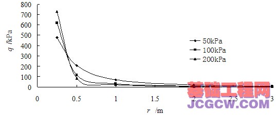 图6 广义剪应力q沿桩径方向的的衰减