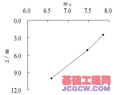 根据计算得到的在不同埋深时黄土体的结构性参数表达式中,取r=0.5m,可以得到距桩轴相同距离条件下结构性参数mη随地基深度z的变化规律(如图10所示)。图中可以看出,当r=0.5m时,结构性参数mη随地基深度Z大致呈线性衰减。