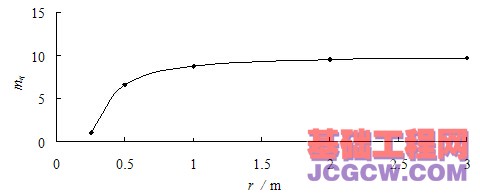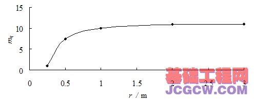 由式(17)可以看出,结构性参数mη随着r的减小而呈现非线性的衰减,衰减到最小值为1.0。当r接近于无穷远处,可以计算出mη=11.1378,与式(9)计算得到的初始结构性参数mη0=11.1378完全一致。黄土结构性参数mη与距桩轴距离r的关系,如图8所示。