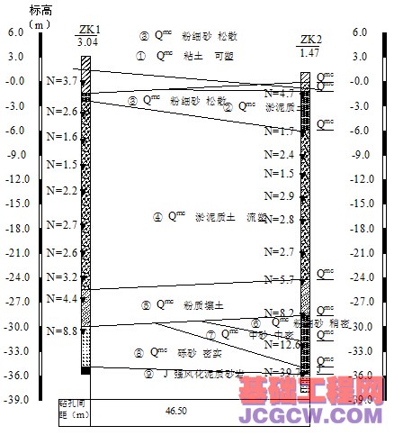场地内岩土层由上而下依次为:①粘土、②淤泥质土、③粉细砂、④淤泥质土、⑤粉质壤土、⑥粉细砂、⑦中粗砂、⑧砾砂、⑨强风化泥质砂岩。工程地质剖面图如图2所示。