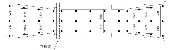 水闸基础采用Φ400混凝土预应力管桩承担主体建筑物的垂直荷载,桩端持力层取在层位稳定,承载力高,工程地质性质好的(8)砾砂层,桩长为32米,单桩竖向承载力设计值为1077.6kN。为了防止水闸两侧堤防高填土引起下卧深厚软弱土层的深层滑动,造成水闸水平位移,本工程水闸部分还采用了15米长的Φ500粉喷桩置换率为15.7%加固表层不良地基土,促使危险滑弧下移,改善地基土的整体抗滑稳定性。水闸部分共布32米长Φ400混凝土预应力管桩39根,15米长Φ500粉喷桩597根,6米长Φ120尾径杉桩183根,闸室前齿采用了长度4米的拉森Ⅲ型的钢板桩,如图3所示。