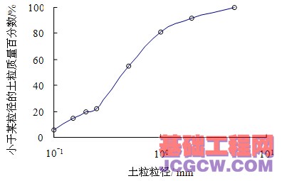 1.39,级配良好,级配曲线见图2。填土厚度为1 m。填土前,先把各桩在模型槽内的分布位置按图1(a)确定好,然后用不同高度的铁条来固定全部模型桩,确保在填土时桩体垂直、平面位置准确;填土时,A桩外侧在不同深度(距离桩顶分别为100、400、600、800、1 100 mm)水平设置直径为