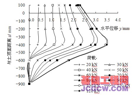 图3为加载过程中,侧向约束桩A在各级荷载(指桩体复合地基承受的荷载,下同)下桩身侧移(水平位移,下同)随与土顶面距离变化曲线。分析发现: