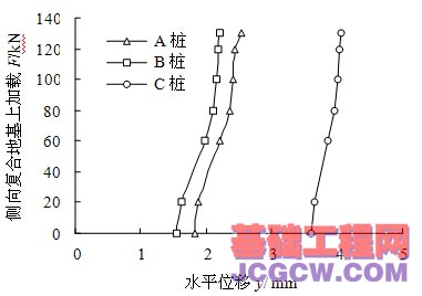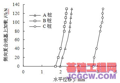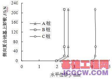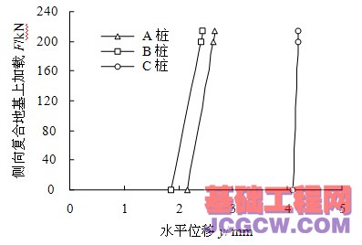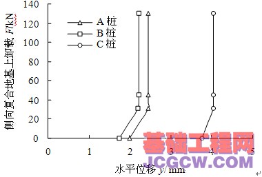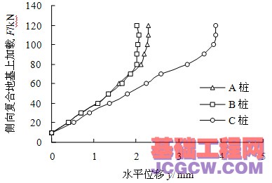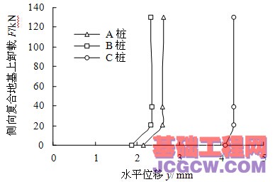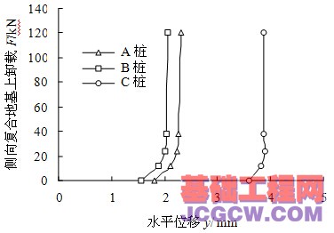 试验前,将加长探针穿过水平PVC管,稳固安装A桩深部的4个数显式百分表,A桩、B桩、C桩的顶部距桩顶100 mm 处分别安装1个数显式百分表。整个试验由千斤顶和压力传感器(采用万能压力机进行标定,由DN-1型多用数显仪采集电信号)加载,通过砝码堆载提供反力。试验参照规范附录B[16]进行,要点为:测试前加载5 kN,以校核实验系统的整体工作性能;首次加载20 kN,随后每级荷载增量为10 kN,根据平台反力与变形特征决定终载;每级荷载前后测读承压板沉降量和侧向约束桩的侧移,以后每0.5 h测读1次,当1 h内承压板沉降小于0.1 mm时加下一级荷载;操作油泵旋纽、尽量分级卸载,每级维持 0.5 h,测读承压板沉降量和侧向约束桩水平位移。在600 mm 500 mm的复合地基上共进行了4次加载和卸载循环,获得了桩体复合地基循环加、卸载过程中侧向约束桩的水平变位规律(获得的其他规律另文讨论)。