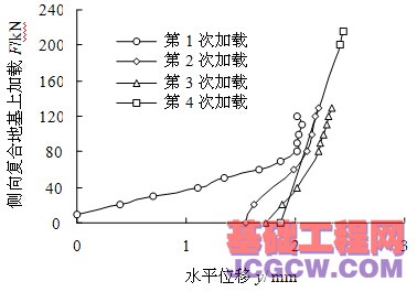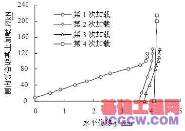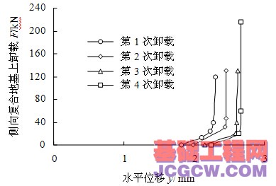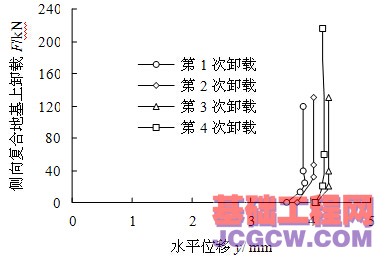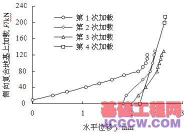 (2)重复加载过程中,若荷载超过首次加载的最大荷载,如第4次加载,侧向复合地基上加载-桩侧移曲线将回到首次加载曲线的延长线,具有记忆效应。这与岩土体的再压缩曲线特征类似[18-19]。