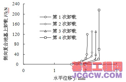 (2)桩体复合地基卸载的初、中期,随着荷载的减小,侧向约束桩的桩顶侧移基本不变,只有卸载到最后1~2级时,桩顶侧移才开始减小、最终停留在永久塑性变形阶段。第