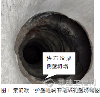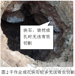 使用传统护壁(素混凝土护壁)方式和旋挖钻机干作业成孔垮孔严重,且无法对块石形成有效的切割、破损。如下图1及图2: