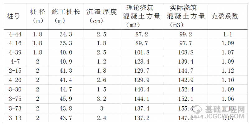 从表2看出,使用全回转工法成桩后,孔底沉渣在1.5~3.2cm左右,根据桩基规范规定端承桩沉渣厚度不应大于5cm,完全满足孔底沉渣厚度要求。混凝土充盈系数在1.07~1.13之间,充盈系数不大于1.2,减少了混凝土材料的浪费。