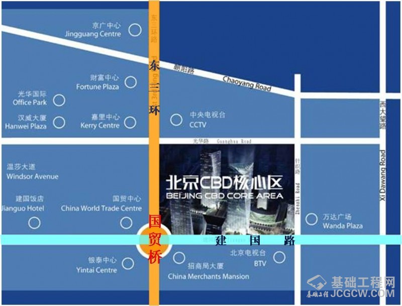 北京CBD核心区位于国贸立交桥东北角,北至光华路,东至针织路,南至建国路绿化带,西至东三环辅路。南北向长度600m,东西向长度500m,占地面积30公顷。