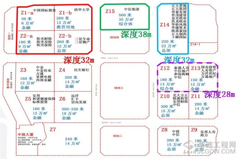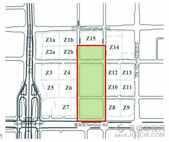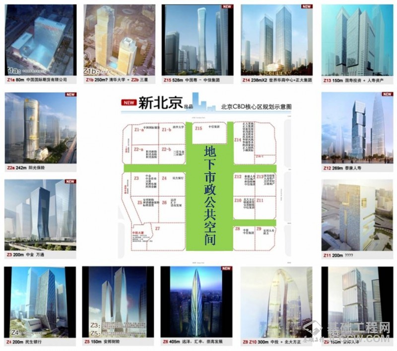 建设用地主要包含地下市政公共空间及17个二级开发地块组成。其中被誉为北京第一高楼的“中国尊”,总高度528m,位于整个建筑群的中轴线上,基坑深度37.8m,为北京第一深基坑。