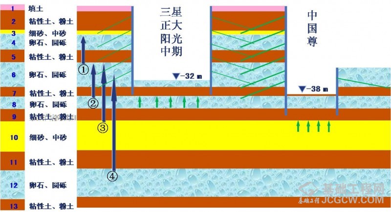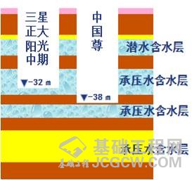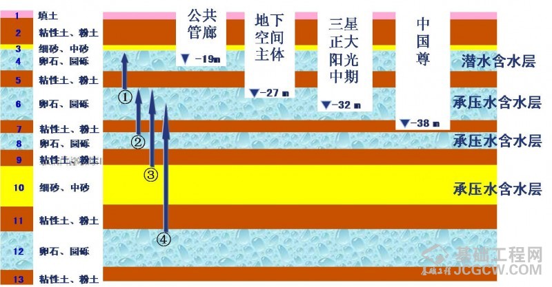 对本项目基坑开挖有影响的地下水主要为潜水和承压水①和承压水②,潜水和承压水①直接影响基坑开挖,承压水②将导致中国尊的基底发生突涌现象。