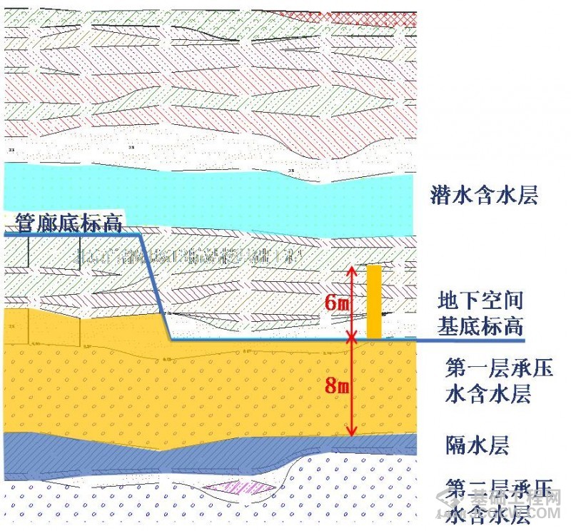经过分析,地下空间受潜水及第一层承压水的影响,基底以下5m范围内没有隔水层,符合帷幕隔水技术不可行条件,可以采取管井降水措施。