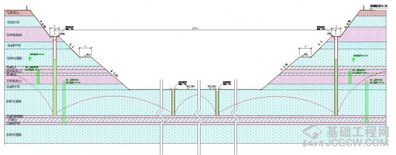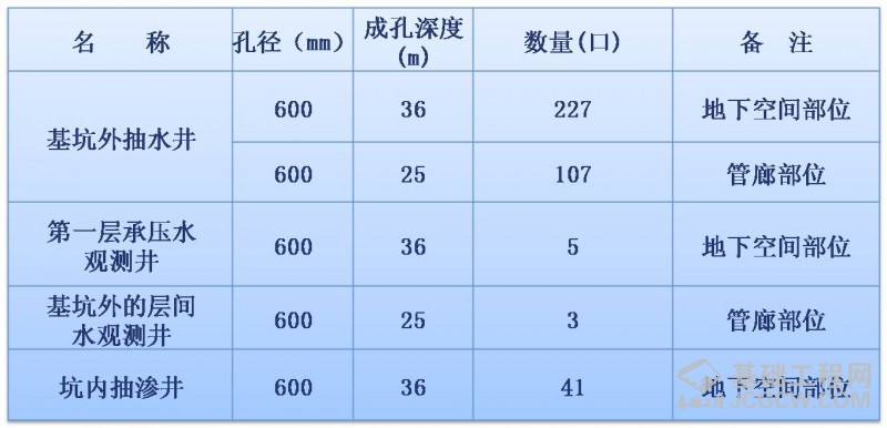 降水井深度参数:管廊部分井深度25m,间距8m;地下空间部分井深度36m,不穿透下部隔水层;基坑中部设置疏干井,深度36m;