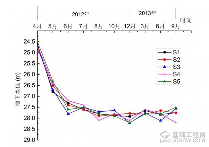 拆迁完成后,由于前期降水施工时间较长,地下水位已经形成较为稳定的漏斗,地下水的补给和抽取已经达到平衡,抽水量较最初计算时有较大减小,降水施工难度大大降低。
