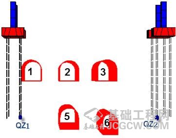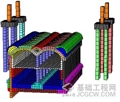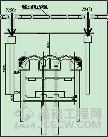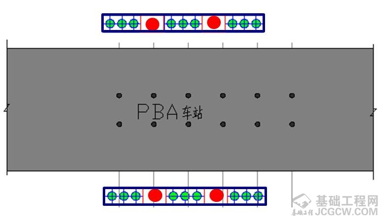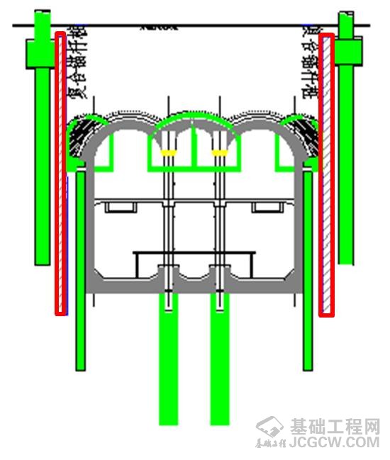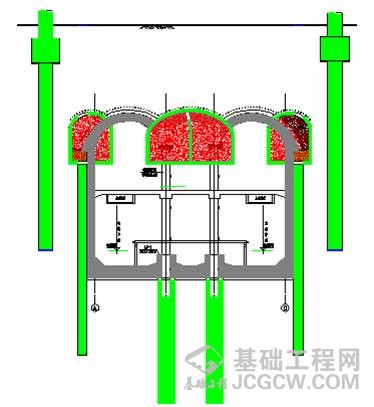 先从地面打车站主体围护桩,上导洞及导洞以上部分采用C15素混凝土桩,桩长14.3m,开挖导洞时进行截桩;导洞以下采用钢筋混凝土桩,桩长19m,比桥桩长处10m。