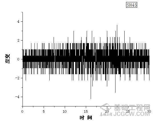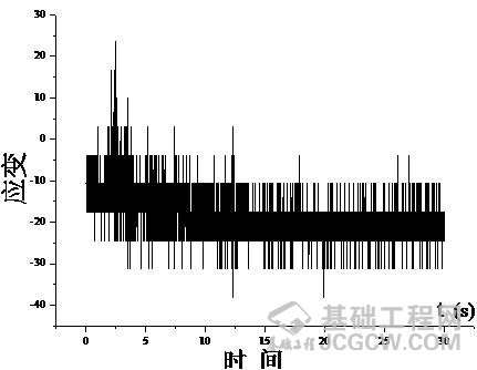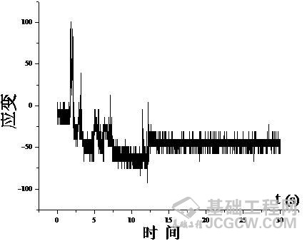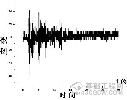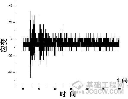 (2)中柱顶端的应变峰值要大于底端的应变峰值,但在顶端的应变基本上一直保持在一个方向,而底端的应变则随地震波波形的变化发生正负方向变化。