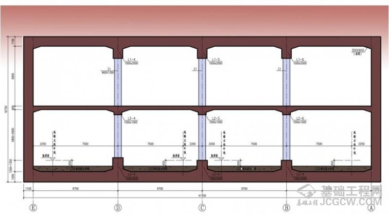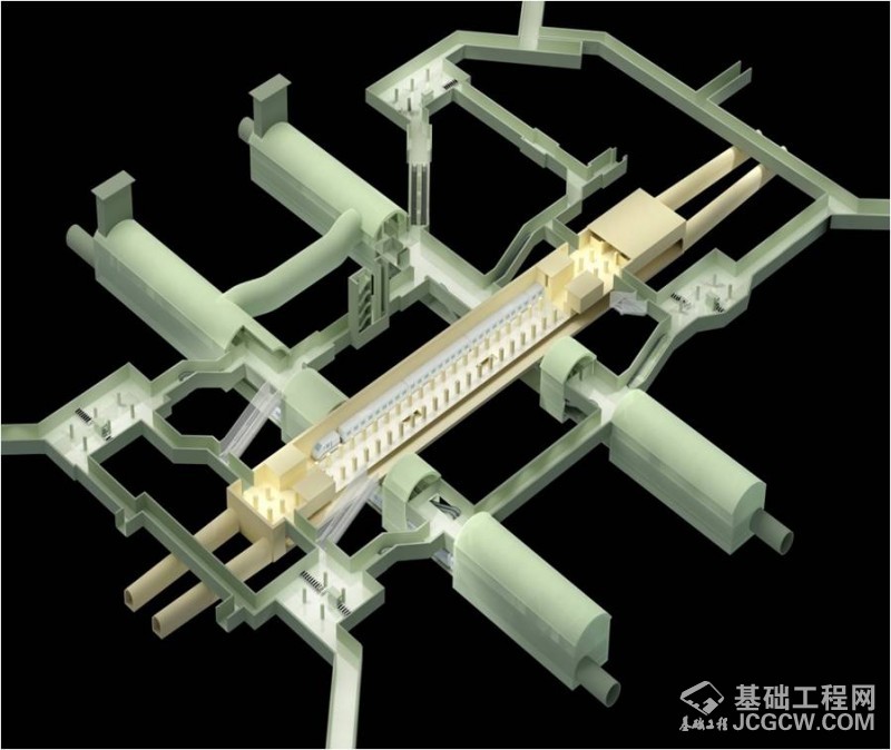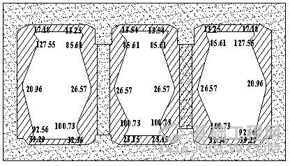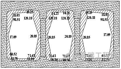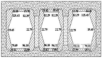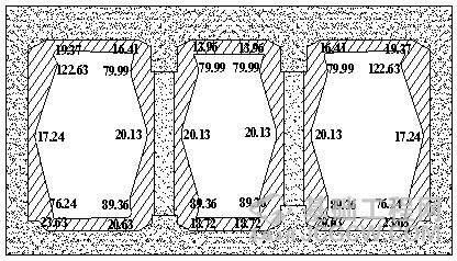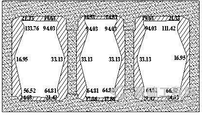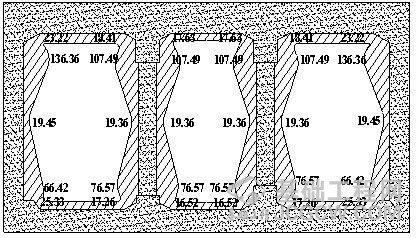 公共区换乘节点:断面宽41.1m,高26.5m,底柱间距19.4m,分叉跨度8.4m