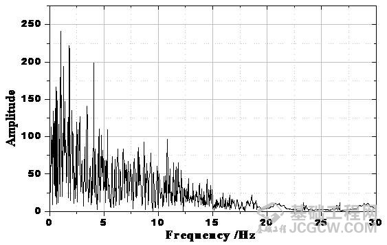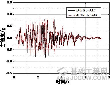D工况和JC0工况中,同一测点的加速度时程曲线的波形基本一致,JC0工况中加速度峰值略小;傅氏谱的频谱成分大致相同,主频范围在5~10Hz。随着激振强度的增加,两种工况同一测点的加速度变化幅度先减小后增大。