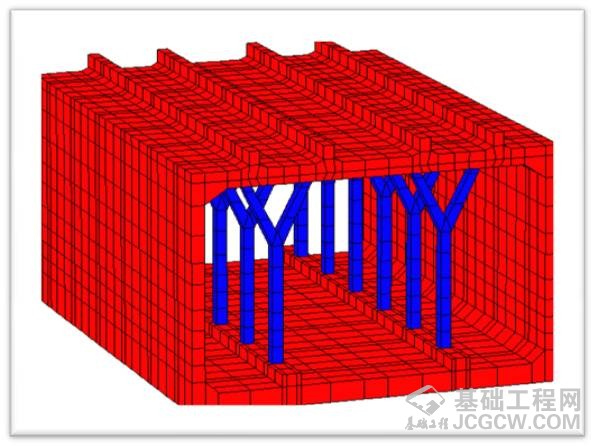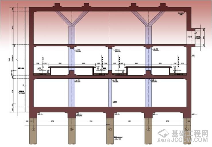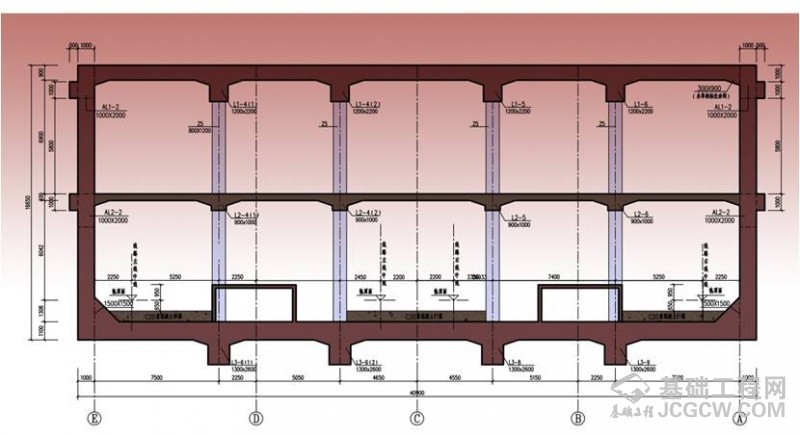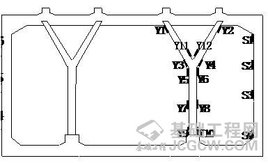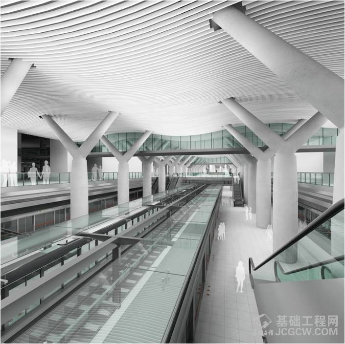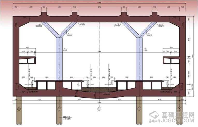 公共区Y形柱断面:断面宽41.9m,高19.4m,底柱间距19.4m,分叉跨度8.4m