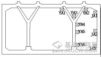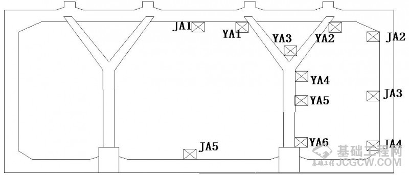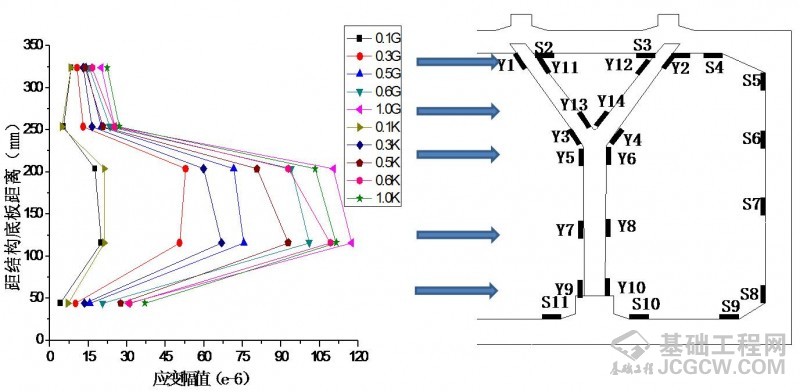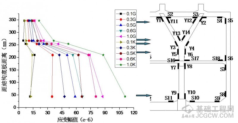 在Y型柱上,应变最大值出现在柱的分叉点下的柱中间位置,即Y7、Y8监测点处,柱顶、柱底与Y型柱分叉点内侧,应变幅值接近,且数值都很小。