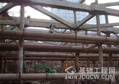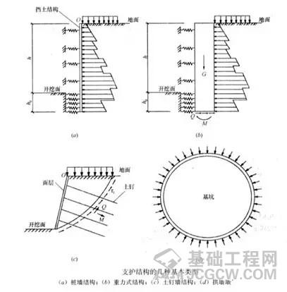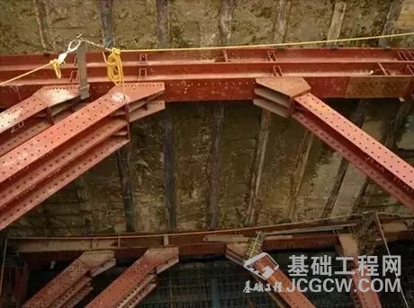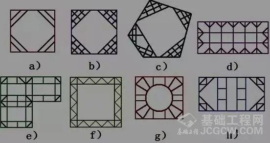 【内支撑的布置形式】支撑体系在平面上的布置形式,有正交支撑、角撑、对撑、桁架式、框架式、圆环形等。