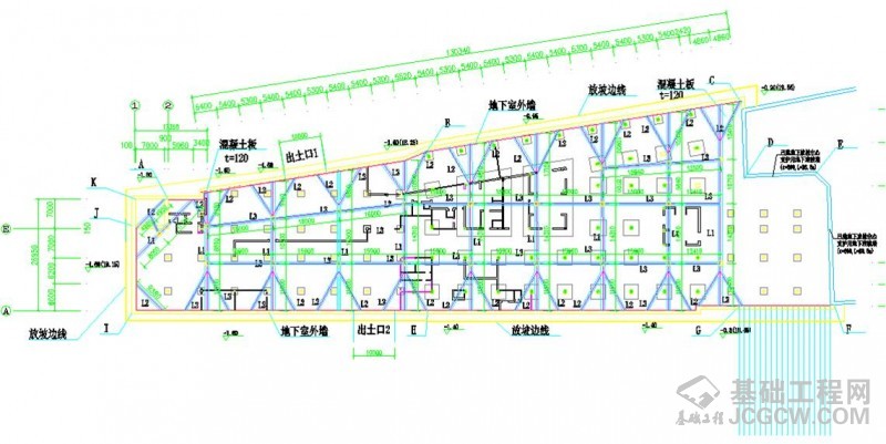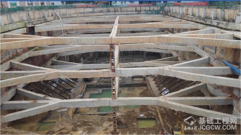基坑支护采用地下连续墙(兼做地下室外墙,抗拔桩,边桩基础,边柱)内侧设置300mm内衬墙+三道内支撑
