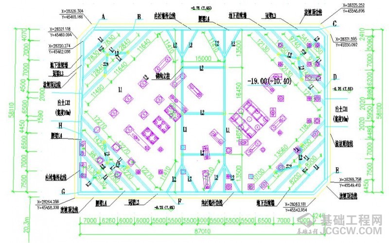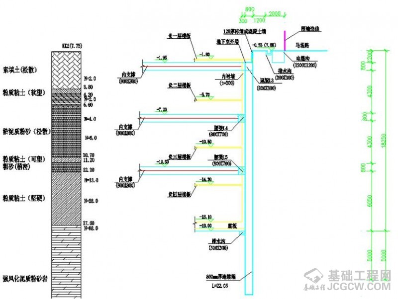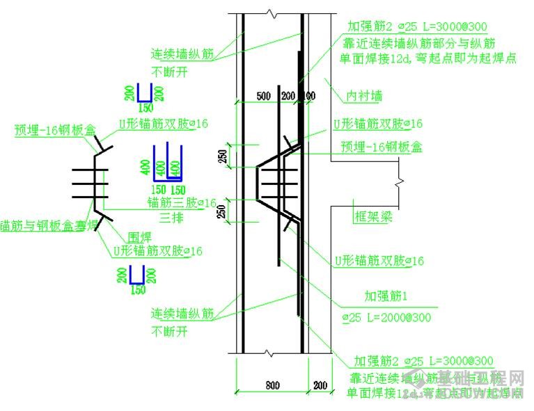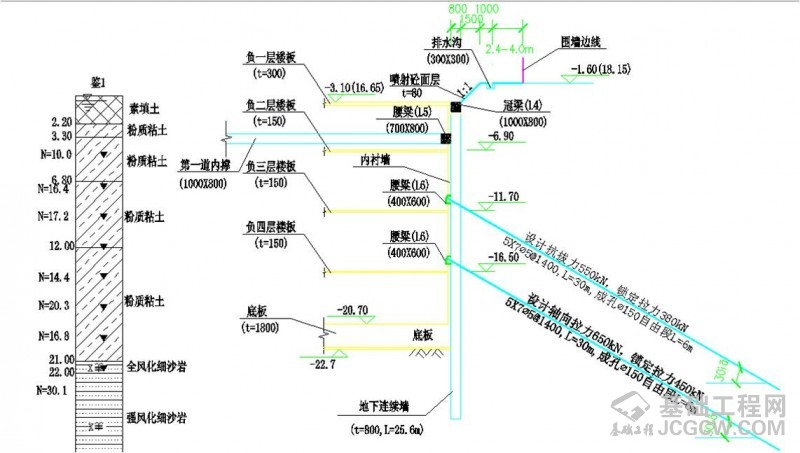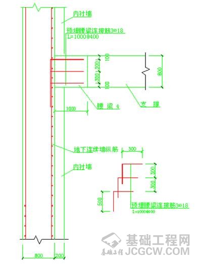 基坑支护采用地下连续墙(兼做地下室外墙,抗拔桩,边桩基础,边柱)+一道内支撑+二道预应力锚索形式。地下连续墙厚度800mm,内侧设置200mm内衬墙。