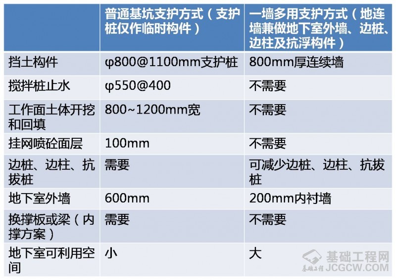 本项目的地下连续墙具有挡土、止水、地下室结构外墙、边柱、边桩基础和抗拔基础的综合作用,实现了一墙多用。
