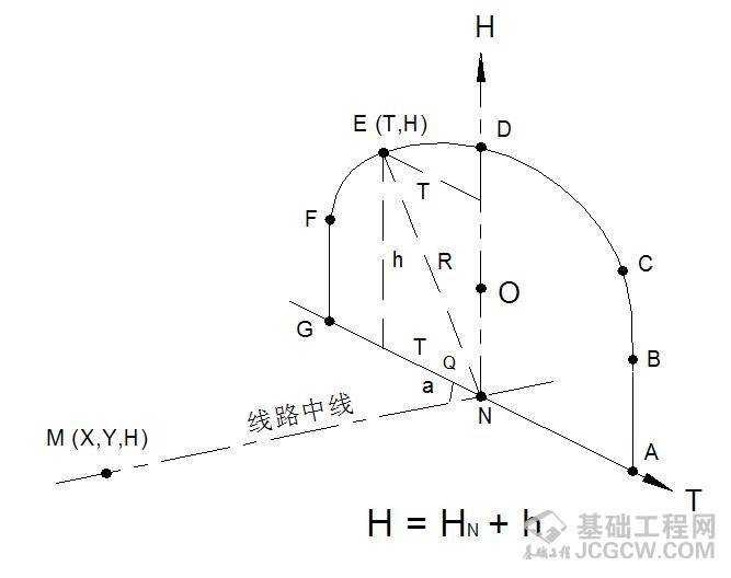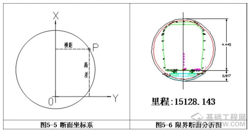 有了断面测点的横距和高差,这样就可以建立一个以设计线路中线与设计轨面交点为原点的坐标系,绘制断面图(如图5-5),此断面图的坐标系与限界设计坐标系是吻合的,方便限界设计对隧道限界进行检查。