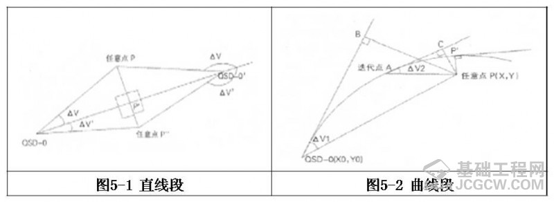 根据文献4,直线段线外一点的里程,可直接通过坐标反算和三角形解算得到该点与起点的里程差(如图5-1),该点的里程便也可简单求得,在此不多说明。这里介绍一下曲线段线外一点里程求算原理。如图5-2,p为断面上的一个测点,首先计算出曲线起点O的坐标及切线方位,通过计算起点O与任意点P的坐标反算出他们连线的方位,这样差值△VI就可算得,解算三角形OBP,算得OB的长度,将OB的长度加上起点里程,得到新起点A的里程,同样的方法算得AC的长度,然后加上A点的里程得到下一个新起点,继续重复迭代,直到计算得到的切线长度为零,停止迭代,得到任意点P对应中桩P’的里程。