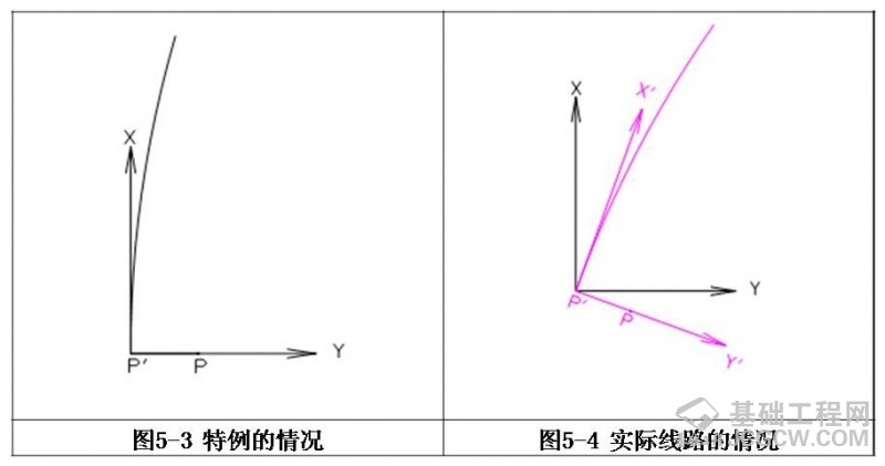 接下来的问题是如何将P’点的切线方位不是0的断面与P’点切线方位为0的情况联系起来,测量工程师比较熟悉的当然是坐标系转换了,如图5-4,沿P’点的切线方向建立新坐标系X’P’Y’,将P点的坐标由原坐标系XP’Y转换到新坐标系X’P’Y’,便可算出P点对应的横距。