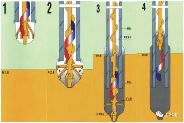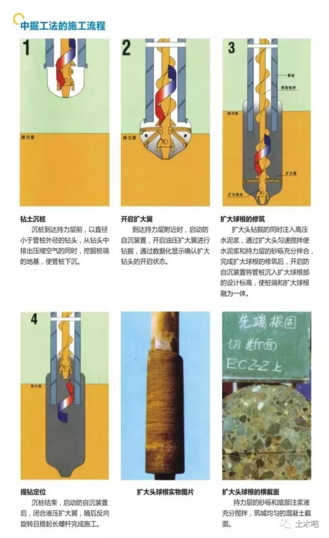 钻土沉桩→开启扩大翼→扩大球根的修筑→提钻定位