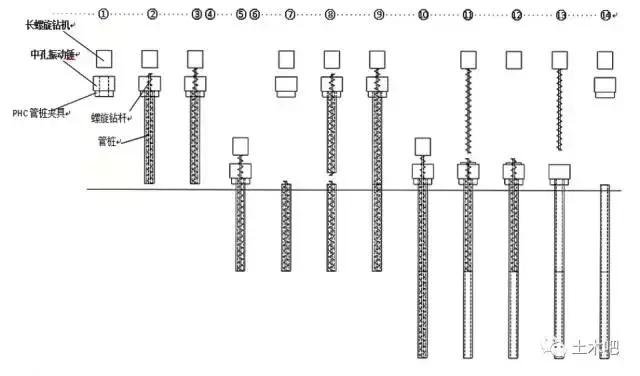 ⑤开启振动锤,下沉管桩,再开启钻机,桩管内取土排土;也可先开启钻机转动取土排土;再开启振动锤下沉管桩;或钻机转动取土排和振动锤振动沉管交替进行;