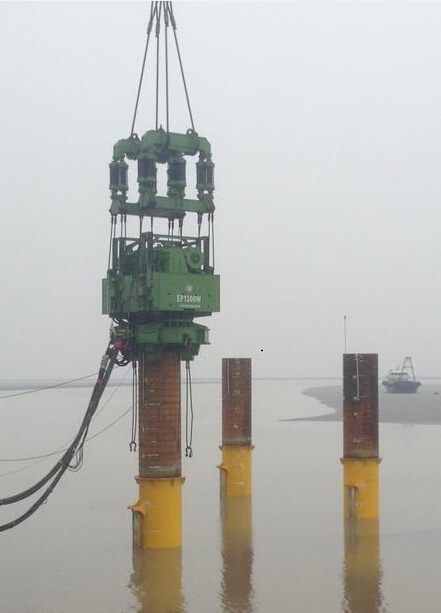 ⑭ 松开夹具,上移中孔振动锤,完成共2节管桩的振沉。