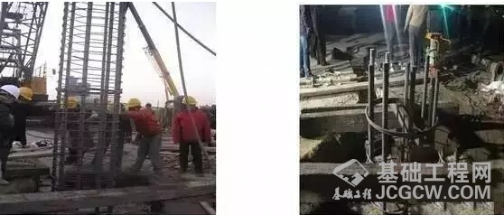 钢筋笼长(超过16m)在孔口焊接,单面焊10d,焊缝高度≥0.3d,焊缝宽度≥0.7d。两段笼子应保持顺直,同截面接头不得超过配筋的50%,间距错开,不少于35d。钢筋焊接完好后,应缓慢下放入孔内,严禁砸笼。