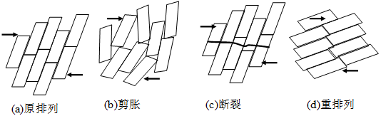 由于土颗粒间不可能都是平面接触,土体的摩擦不会是简单的颗粒间沿表面的滑动摩擦,。由于颗粒间的犬牙交错的排列,使在剪切面处的颗粒发生提升、错动、转动、拔出,并伴随着土的体积改变、颗粒的重定向排列及颗粒本身的破碎断裂,见图3。在剪切力作用下,如果组成土颗粒的强度高,压力和剪力不大,则颗粒会发生转动、移动而使土变松,土体积扩大,产生剪胀,如图3(b);如果颗粒矿物较弱,压力与剪力很高,则可能产生颗粒的剪断、破碎, 如图3(c);在约束条件较松,颗粒中的针片状较多,强度也不低。可能发生颗粒的重排列, 如图3(d)。而实际上这几种情况可能是同时、混合发生的。