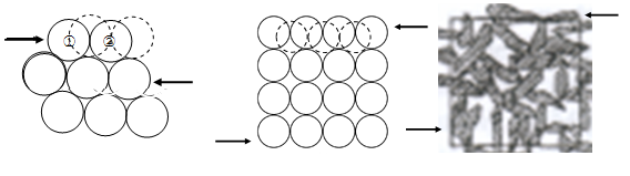 在图3中表示了在有咬合情况下剪切土颗粒的三种可能的相互位置的变化(b),(c)和(d),在某一正应力与剪切力作用下,这三种情况都是可能发生的,决定性的因素在于在这种具体内外因条件下哪一个的抗力最小,或者说哪一个耗费的能量最小。所谓的“不是鱼死就是网破”就是这个道理,或者说“凡是现实的都是合理的”。