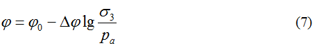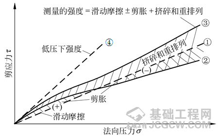 随着围压(或正应力)的增加,颗粒破碎以及剪胀的减少,使土的内摩擦角减小,因而对于粗粒土,其抗剪强度包线通常是非线性的,可表示为