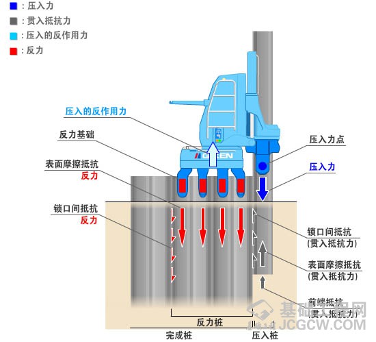 压入是指,利用静载荷将预制桩(工厂生产的桩)压入到地下所定深度的一种打桩工法。利用冲击、振动等方法将预制桩打入地下的传统打桩工法自身存在着负面因素,必然会产生以噪音,振动为主的建设公害。除此之外,利用钻孔方式将预制桩埋入预先钻掘完成的钻孔内的工法会产生大量的排土和泥水。因此,与其它工法相比,压入工法克服了这些缺点。