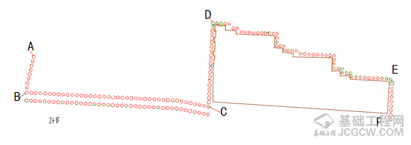 (1)AB、DF段,基坑高度5.5~9.0m,垂直开挖,采用人工挖孔桩+双液高压注浆+锚杆(局部)+网喷联合支护,人工挖孔桩桩径1.2m间距2.0m,桩长20.0~22.0米,嵌入深度15.0m。因为土质条件较差,人工挖孔桩开挖过程中要及时进行护臂,保证护臂深度满足开挖深度要求,同时拆模前必须保证护臂混凝土强度。基坑底梅花型布设三排注浆管,采用φ50注浆管,间距1.0m,长度约13.0m,加固桩周围土体,增强人工挖孔桩的稳定性,基坑顶梅花型布设两排注浆管,采用φ50注浆管,间距1.0m,长度约21.0m 。注浆深度内,浆液挤压密实填土,填充填土中的缝隙同时提高填土的密实度,并与土成形土、混凝土共同体,使桩前填土起到帷幕止水的作用。