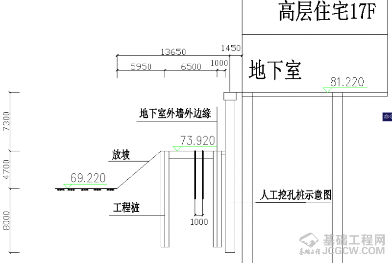 (2)BD段,基坑高度12.6~18.1m,靠近建筑一侧垂直开挖,采用人工挖孔桩+双液高压注浆+工程桩联合进行支护,人工挖孔桩桩径1.4m间距2.0m,桩长18~30.0m,嵌入深度10.0~20.0m。因为土质条件较差,人工挖孔桩开挖过程中要及时进行护臂,保证护臂深度满足开挖深度要求,同时拆模前必须保证护臂混凝土强度。桩间梅花型布设二排注浆管,采用φ50注浆管,长度5~8m,间距1.0m,加固桩周围土体,增强人工挖孔桩的稳定性,防止桩间土挤出。工程桩为在建、构筑物中受力起作用的桩,提前建造可与其他基坑支护共同保护基坑稳定,同时可降低基坑支护成本。