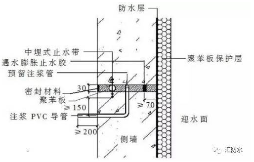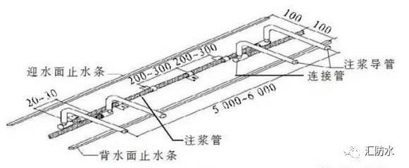 预埋注浆管施工工艺流程:清理混凝土接缝→安设预埋注浆管→安设遇水膨胀止水胶→检查验收→结构混凝土施工→灌注弹性聚氨酯浆液或丙烯酸盐浆液。