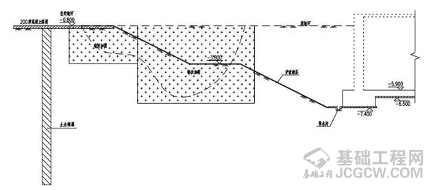 出于建筑功能的需要,电梯井和集水井等通常都比普遍基底开挖深度深。对于位于基坑周边的基底深坑或位于基坑中部、但落深较大的基底深坑应预先进行土体加固处理,落深特别大时还需设置板式支护保证基底深坑的侧壁稳定性。基底深坑加固应综合考虑基坑土体残余应力、落深深度、地下水处理等因素,按重力式挡土墙进行加固体深度和厚度的估算,必要时应进行封底加固处理。