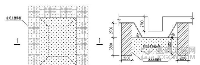 当软弱土层位于基坑周边开挖范围内时,由于其多呈现流塑~软塑状态,且土体渗透性较差,疏干降水效果不理想,因此土方开挖有一定的困难。为了给土方开挖创造条件,加快施工进度,也可以对土体进行加固处理。