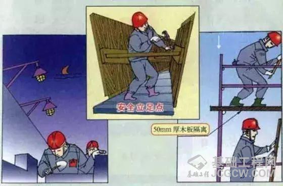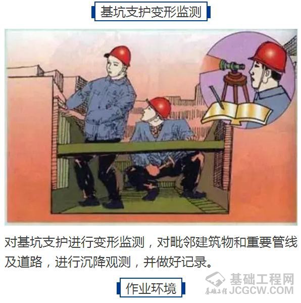 在基坑内作业,作业人员要有安全立足点;垂直作业要进行隔离防护;光线不足的地方要设置照明灯。